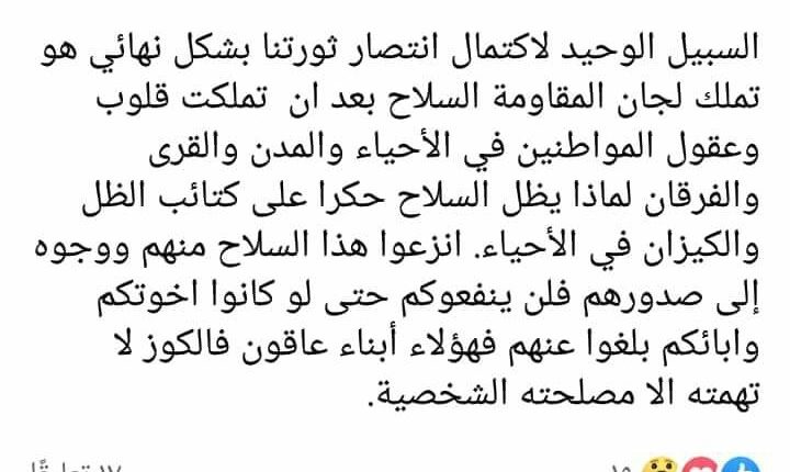 عضو لجنة المقاومة الذي وصف نفسه بالفاعل في اللجان قال : ” السبيل الوحيد لاكتمال انتصار ثورتنا بشكل نهائي هو تملك لجان المقاومة السلاح بعد أن تملكت قلوب و عقول المواطنين في الأحياء و المدن و القرى و الفرقان لماذا يظل السلاح حكرا على كتائب الظل و الكيزان في الأحياء انزعوا هذا السلاح منهم و وجوه إلى صدورهم فلن ينفعوكم حتى لو كانوا اخوتكم و ابائكم بلغوا عنهم فهؤلاء ابناء عاقون فالكوز لا تهمته الا مصلحته الشخصية .