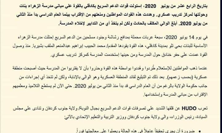 وبحسب بيان للمنظمة الحقوقية تلقته فإن قوات ” الدعم السريع بكادقلي استولت بالقوة على مباني مدرسة الزهراء بنات وحولتها لمركز تدريب عسكري، مُنذ 14 يونيو الفائت”.