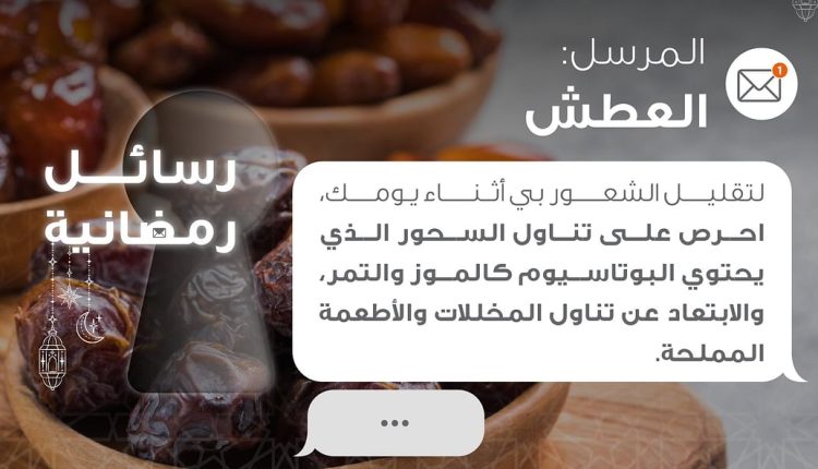 وقالت، تحت وسم #رمضانك_مفتاح : لتقليل الشعور بالعطش أثناء يومك؛ احرص على تناول السحور الذي يحتوي البوتاسيوم، كالموز والتمر.