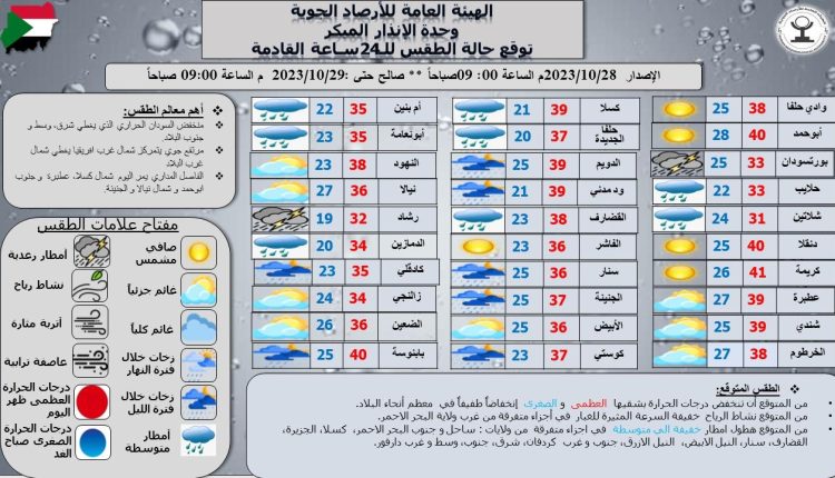 توقعت هيئة الارصاد الجوية في نشرتها اليوم السبت ان تنخفض درجات الحرارة الكبرى والصغرى انخفاضا طفيفا في معظم انحاء البلاد. كما تنبأت بهطول امطار خفيفة الى متوسطة في عدد من الولايات شملت ساحل وجنوب البحر الاحمر، كسلا، القضارف، ،سنار، الجزيرة، النيل الازرق، النيل الابيض، جنوب وغرب كردفان، شرق وجنوب ووسط وغرب دارفور. سجلت اعلى درجة حرارة بالبلاد ليوم امس (41،5) درجة في مدينة كريمة، وادناها(21) درجة في كل من كسلا، حلفا الجديدة، رشاد، الدمازين. أعلى درجة حرارة متوقعة ظهر اليوم (41) درجة في مدينة كريمة، وادناها(19) درجة صباح الغد في مدينة رشاد .