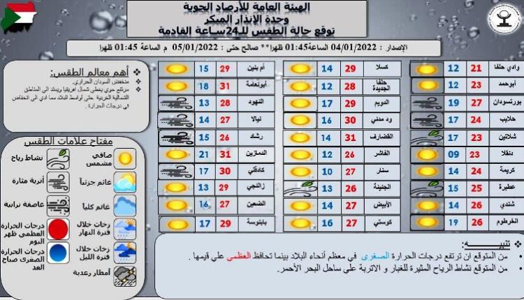 توقعت هيئة الارصاد الجوية في نشرتها اليوم الاربعاء ان ترتفع درجات الحرارة العظمى والصغرى ارتفاعا بمقدار درجتين الى ثلاث درجات في جميع انحاء البلاد. كما تنبأت بهطول امطار خفيفة في جنوب شرق ساحل البحر الاحمر وولاية النيل الازرق. سجلت اعلى درجة حرارة بالبلاد ليوم امس (38،8) درجة في مدينة ابونعامة، وادناها (13،5) درجة في دنقلا. أعلى درجة حرارة متوقعة ظهر اليوم (40) درجة في مدينة ابونعامة وادناها (16) درجة صباح الغد في مدينة دنقلا.