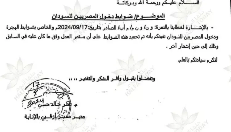 وقالت في خطاب معنون الى مدير المعبر، إنه بحسب توجيهات مدير الإدارة العامة للجوازات والهجرة السودانية، فرض ضوابط هجرية جديدة بالنسبة للمصريين.