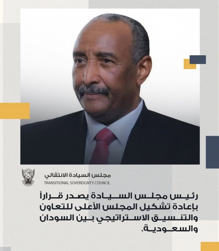 أصدر السيد رئيس مجلس السيادة الانتقالي القائد العام للقوات المسلحة، الفريق أول الركن عبد الفتاح البرهان، قراراً يقضي بإعادة تشكيل المجلس الأعلى للتعاون والتنسيق الاستراتيجي بين جمهورية السودان والمملكة العربية السعودية.