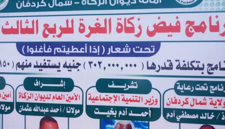وقال مولانا آدم أبشر إبراهيم أمين الزكاة بشمال كردفان أن تكلفة المشروعات الإنتاجية والبرامج الخدمية التى نفذها الديوان بلغت أكثر من ٣ مليون جنيه ، مشيراً أنه تم توزيع أكثر من ٨ ألف جوال ذره للخلاوى والمساكين بالولاية وتطرق للمخيم الرعوى الذى ينفذه الديوان بمنطقة كازقيل مشيراً أن المخيم يحتوى علي أدوية مجانية وإرشاد رعوى وتدريب بهدف التعايش السلمى بين الرعاة والمزارعين