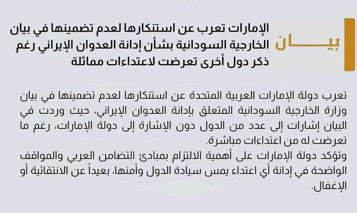 وأبدت أبوظبي استغرابها من شمول البيان السوداني تضامناً مع عدة دول تعرضت لاعتداءات مشابهة، في حين تم استثناء دولة الإمارات التي واجهت بدورها هجوماً إيرانياً مباشراً، معتبرة أن هذا المسلك يبتعد عن أعراف التضامن العربي المشترك.