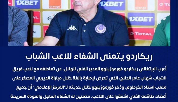 ابدي مدرب الهلال ريكاردو تعاطفه مع شبل الهلال هشام عامر الذي تعرض لبلع لسان في مباراة القمة المصغرة والتي خسرها الهلال برباعية وقال ان الجهاز الفني يتمنى عاجل اللشفاء لعامر وان يعود لمواصلة نشاطه مع الهلال.