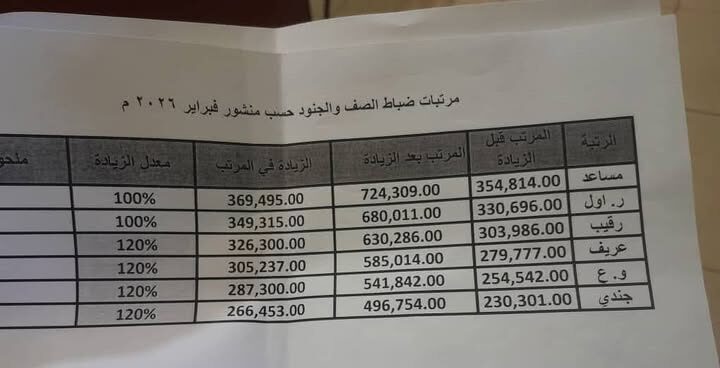وقالت مصادر مطلعة إن رواتب الضباط تجاوزت 1,000,000 جنيه لرتبة الملازم، مع زيادات تصاعدية تصل في بعض الرتب العليا إلى أكثر من 3,000,000 جنيه، في إطار ما وصفته المصادر بأنه دعم مباشر للقوات النظامية بعد مشاركتها في العمليات العسكرية الأخيرة.